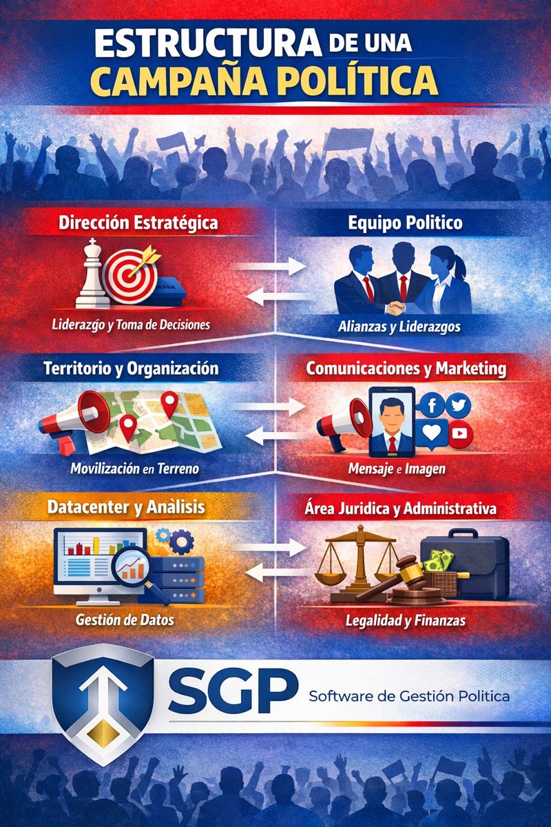 La estructura de una campaña política es el conjunto organizado de equipos, roles, procesos y recursos que permiten convertir una propuesta política en una opción electoral viable y competitiva. Está conformada por una dirección estratégica que define el rumbo, un equipo político que articula liderazgos y alianzas, un componente territorial encargado del trabajo de base y la movilización ciudadana, un equipo de comunicaciones y marketing que construye el mensaje y posiciona al candidato, un datacenter o área de información que gestiona y analiza los datos, y un frente administrativo y jurídico que garantiza el cumplimiento legal y el uso eficiente de los recursos. Esta estructura representa la columna vertebral del proyecto político, porque le da orden, coherencia y capacidad de ejecución; sin ella, las ideas no se materializan, pero con una estructura sólida, el proyecto se vuelve sostenible, medible y capaz de generar confianza, gobernabilidad y resultados electorales.